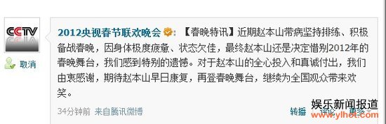 娱乐hot网最新微博评论:赵本山退出龙年春晚,你如何看待?